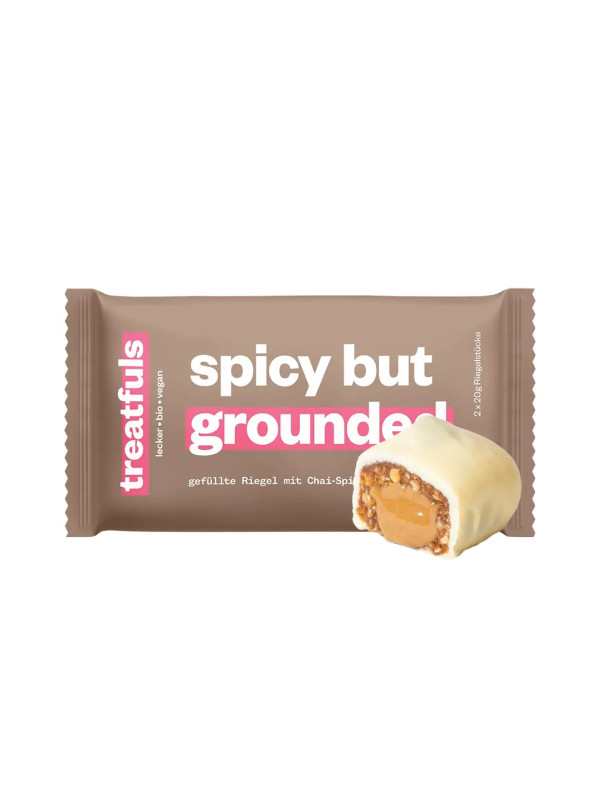 Pasta de dátiles, cobertura de manteca de cacao blanca (15 %) (manteca de cacao, bebida de arroz en polvo, coco en polvo, edulcorante: eritritol, naranja en polvo), relleno de avellana (15 %) (avellana (42 %), dátiles en polvo, manteca de anacardo, manteca de cacao), harina de avena sin gluten, avellana (8,4 %), sirope de dátiles, manteca de almendras, fibra de tapioca, mezcla de especias chai (1,45 %) (canela, jengibre en polvo, cardamomo, nuez moscada, clavo en polvo, cilantro en polvo, pimienta de Jamaica), manteca de cacao, sal marina, extracto de vainilla.