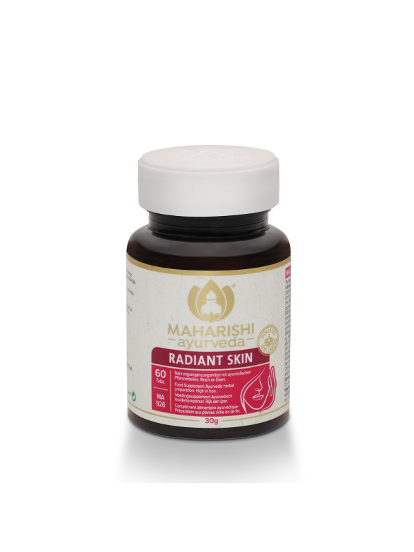 Según el Ayurveda, la salud de la piel refleja el equilibrio de los tres doshas: Vata, Pitta y Kapha, así como el buen funcionamiento del hígado, la sangre y la digestión. Radiant Skin actúa sobre estos ejes, favoreciendo una piel luminosa, clara y equilibrada.
