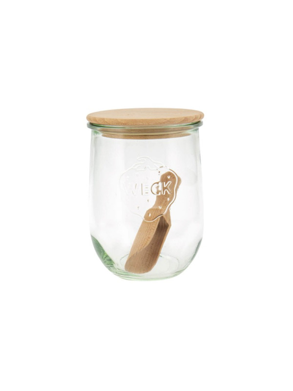 Tarro de vidrio de la serie Tulip de 1,06 l de capacidad, de Weck. Con tapa de madera de haya sin tratar y aro de silicona, para un sistema de apertura y cierre seguro y cómodo. Incluye una práctica cuchara de madera para servir. El tarro tiene la boca ancha, de 10 cm de diámetro por lo que permite un llenado fácil. Ideal para almacenar alimentos secos como galletas, pasta, arroz, frutos secos, harinas, especias, etc., y también para hornear bizcochos, masas, etc. sin la tapa.